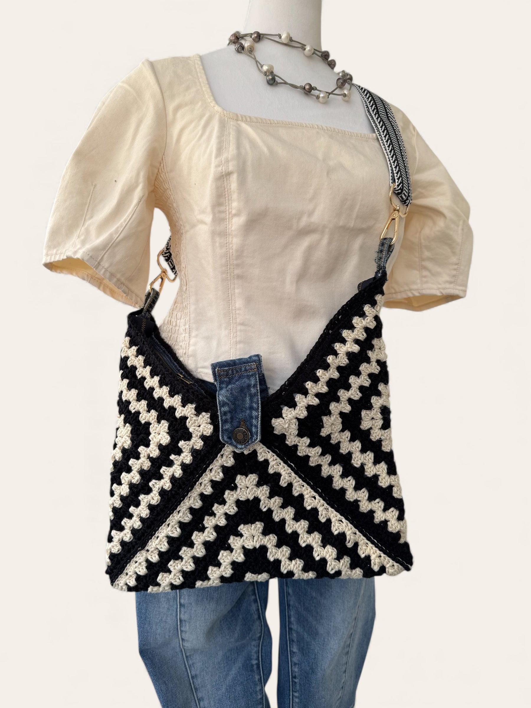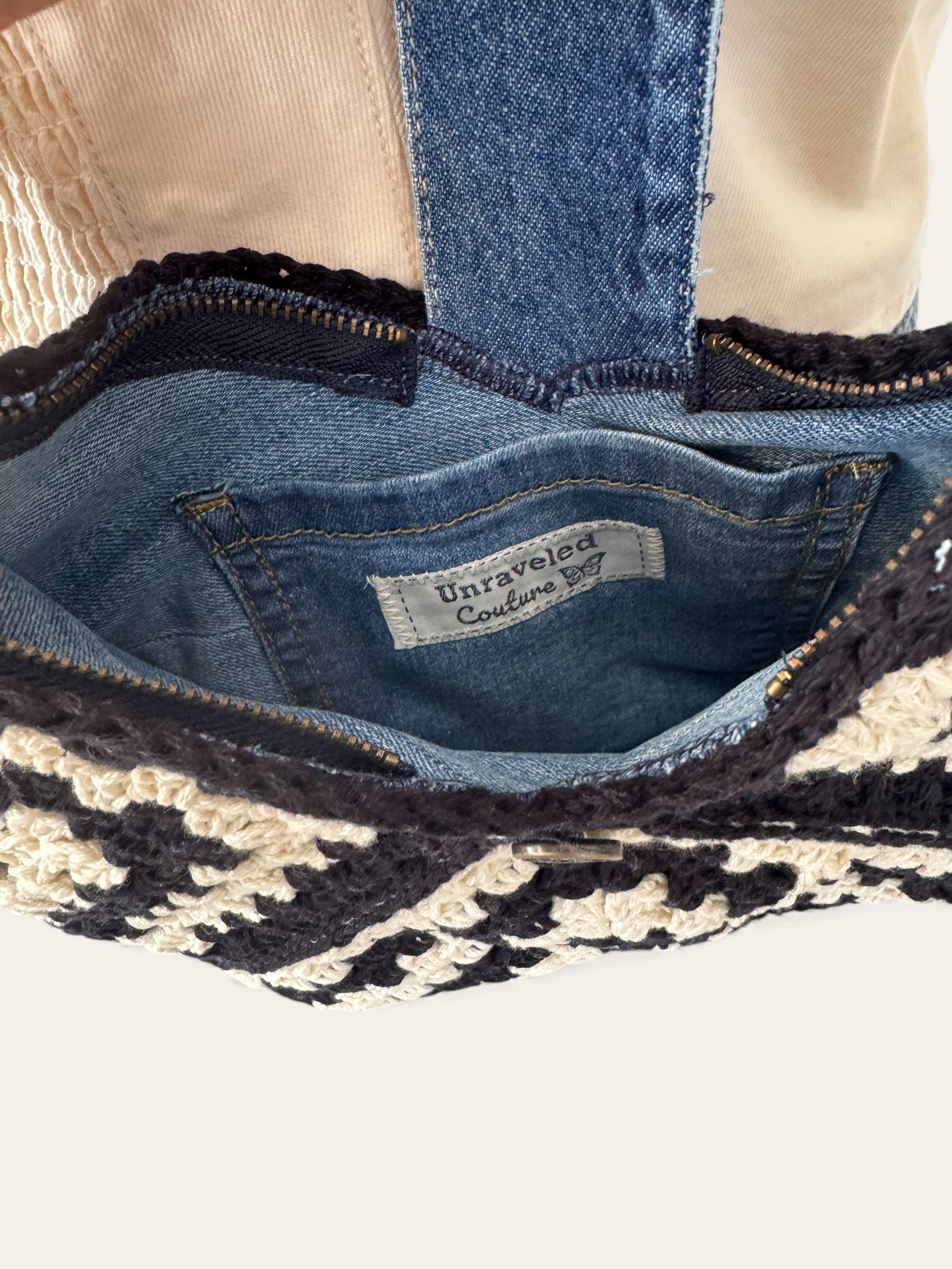 This one-of-a-kind black & cream LUNA hand crochet cross-body crescent shape bag has an upcycled denim interior, with a jean pocket, zippers and flap closure.