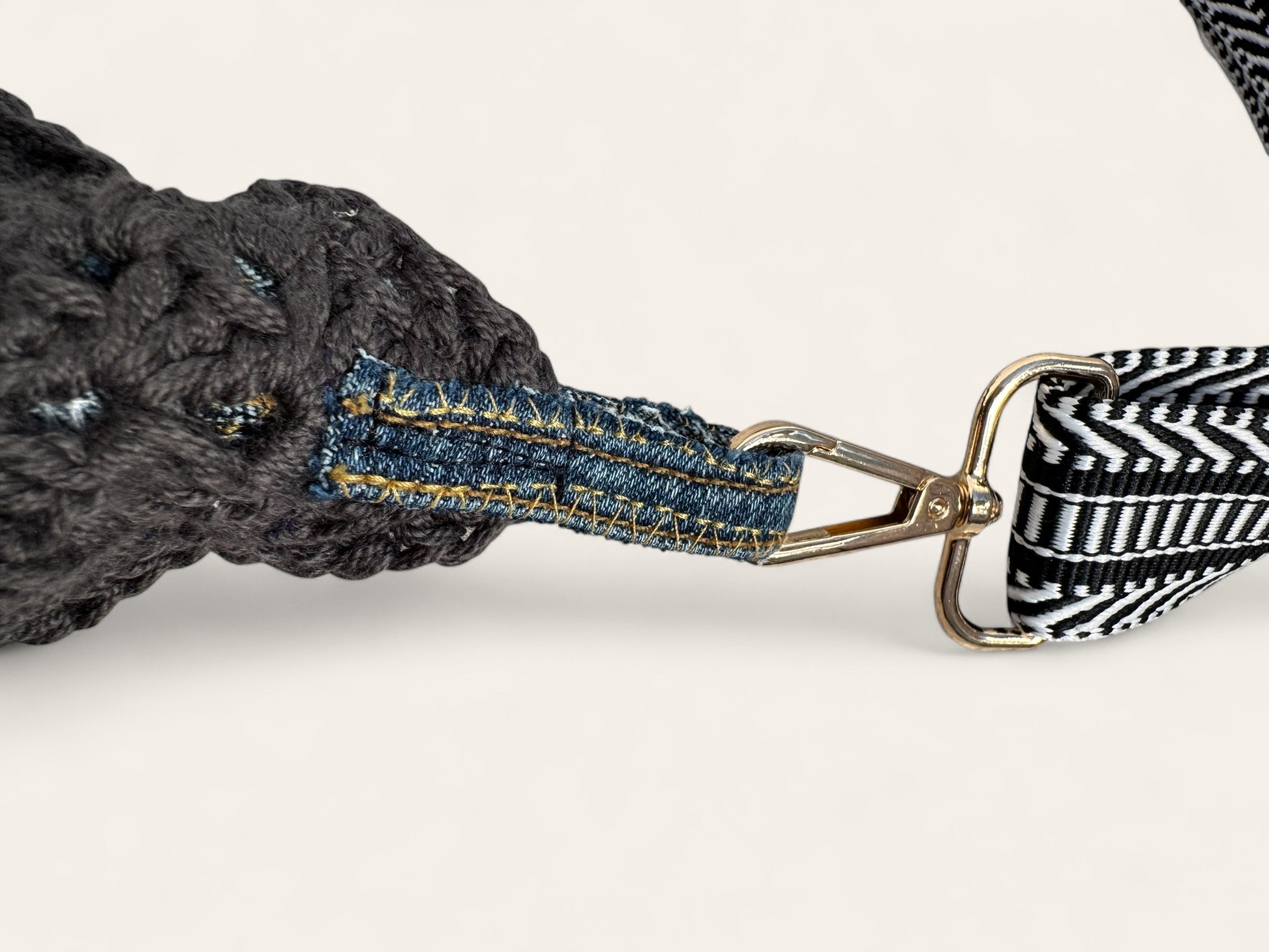 This one-of-a-kind Cloud colored LUNA hand crochet cross-body crescent shape bag has an upcycled denim interior, with a jean pocket, zippers and flap closure.