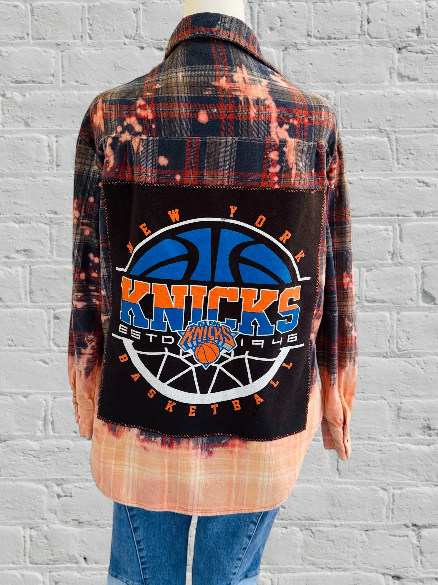 Custom hand bleached soft red/blue/orange distressed, bleached upcycled flannel with NY Knicks t-shirt and embroidery embellishment details (on back and front of flannel).
