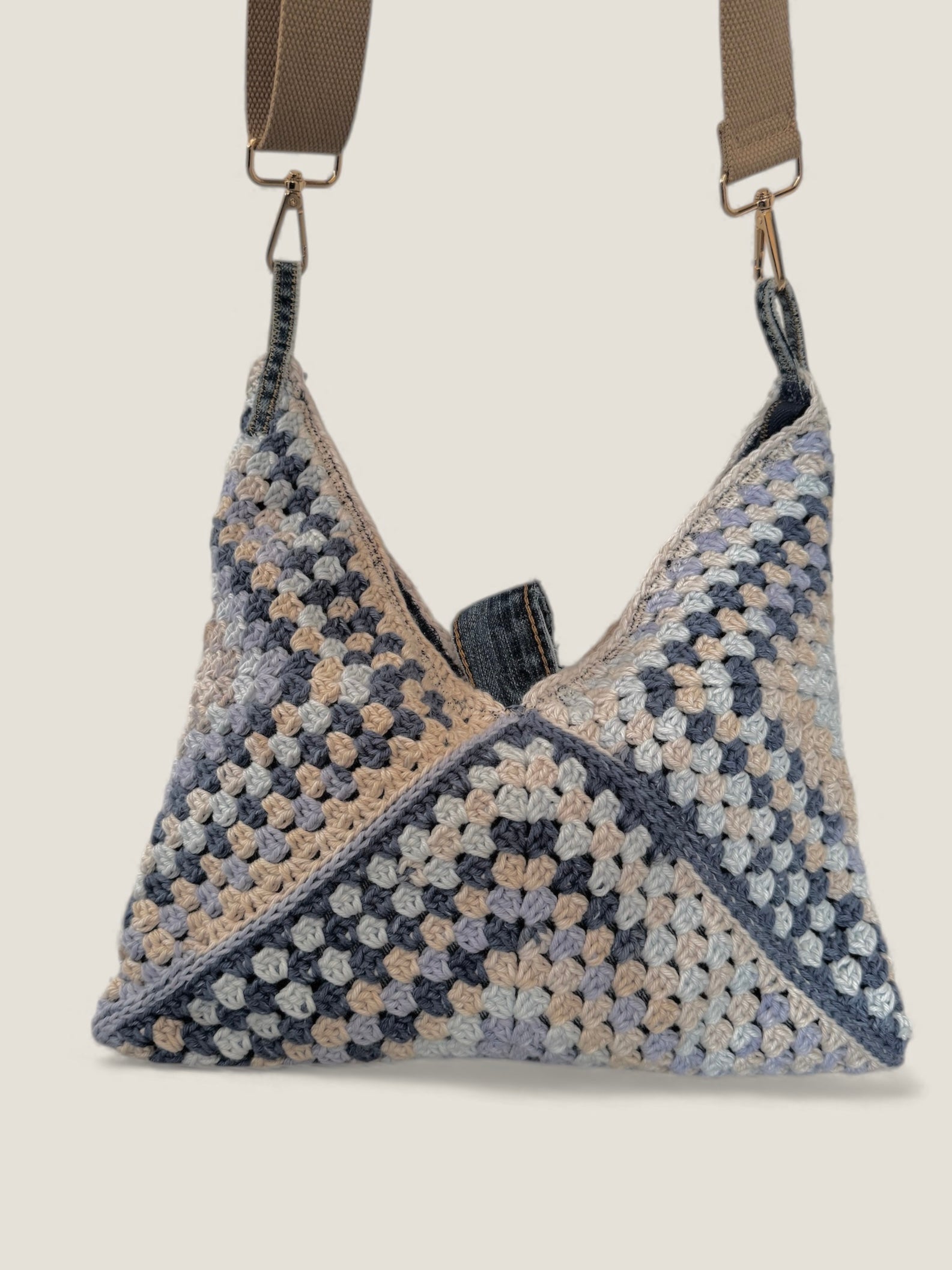 This one-of-a-kind Sky & Sand LUNA hand crochet cross-body crescent shape bag has an upcycled denim interior, with a jean pocket, zippers and flap closure.